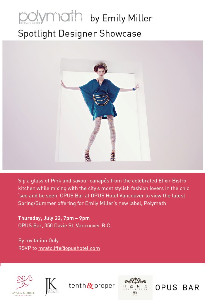 This summer is busier than ever - and tonight I'm happy to share with that I will be taking part in Polymath's fashion show & private sale event at the Opus Hotel's bar Elixir. I'm sponsoring the event's goody bags (for the 1st 100 guests!) and I will have also a little display with my perfumes, jewelry, candles and some AMAZING new truffle flavours that I've been concocting this summer. I'm so excited to have my perfume line displayed alongside Tenth & Proper, AnyHat, and of course Emily Miller's fabulous dresses for Polymath Fashion!From Emily's original invite: